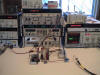 The blue colored object is a directional coupler that sends the signal to both the spectrum analyzer and the counter.
